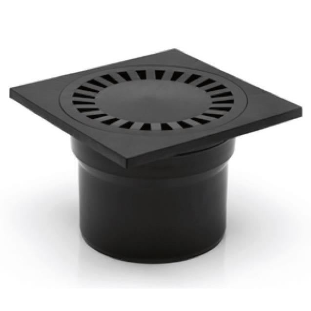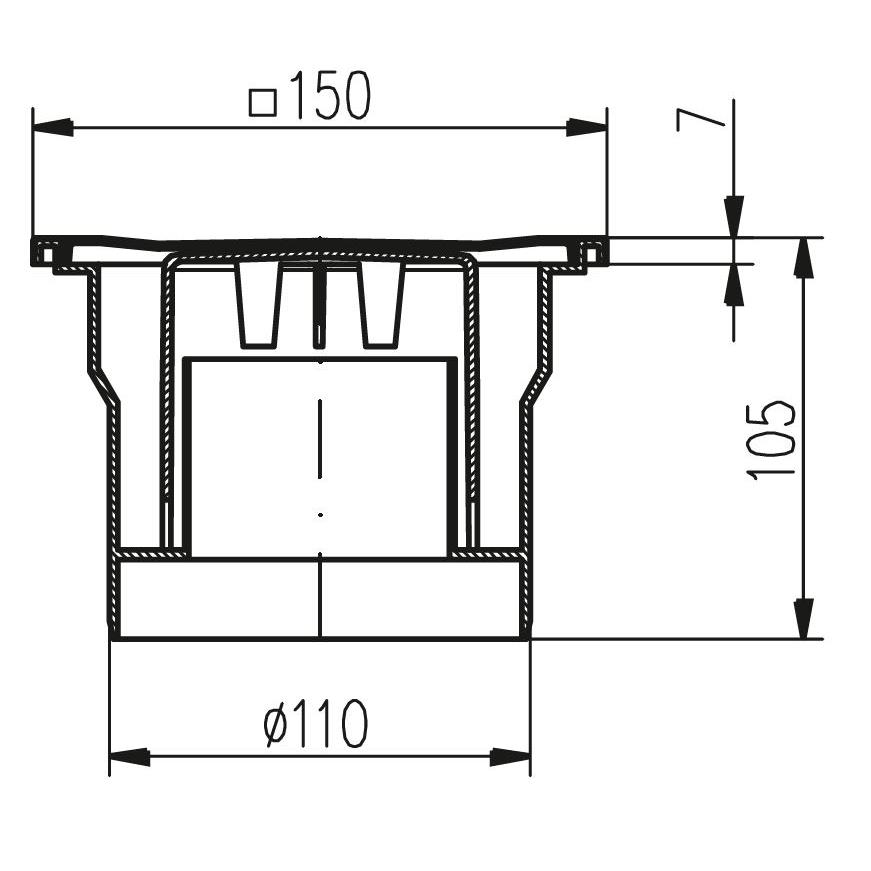 - Rost: 150 x 150 mm / Aufbauhöhe: 105 mm / senkrechter Abgang / genaue Abmessung siehe Bild