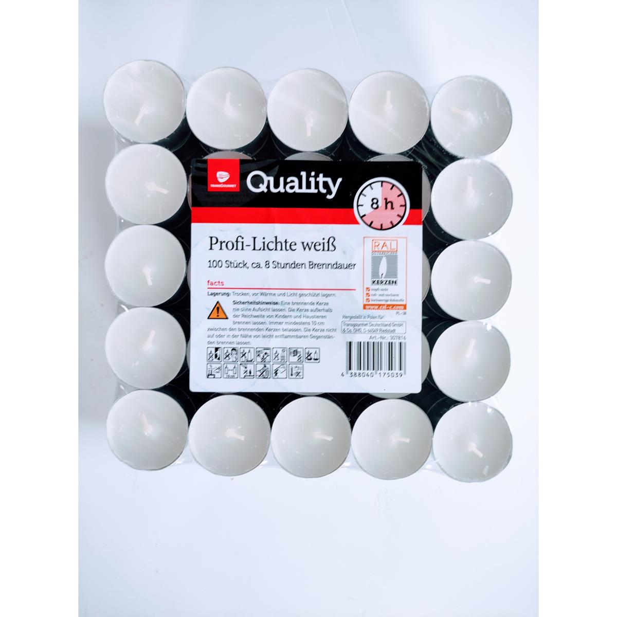 Eigenschaften:- 200 Stück weisse Profi Teelichter mit Ø 39 mm
